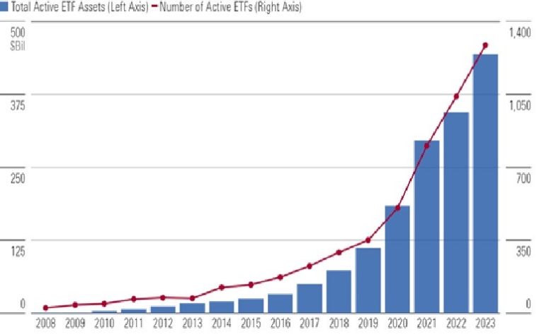 Aşağıdaki grafik, aktif ETF’lerin AUM ve sayı bazında büyümesini gösteriyor: