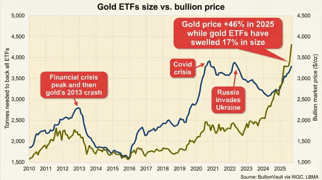 Kısacası, grafik “Altın fiyatı uçuyor ama ETF’lerdeki gerçek altın miktarı o kadar hızlı büyümüyor” diyor